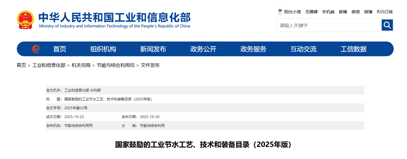 10月30日,中华人民共和国工业和信息化部 水利部联合发布《国家鼓励的工业节水工艺、技术和装备目录(2025年版)》。目录按工艺、技术和装备所处阶段,主要分为研发类、产业化示范类和推广应用类。涵盖了共性通用技术和钢铁、石化化工、纺织印染等13个工业行业的节水工艺、技术和装备,共计150项。